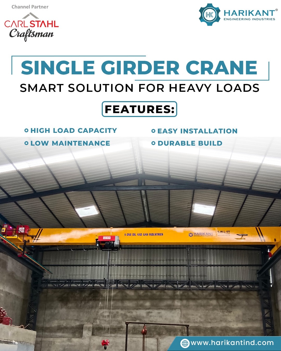 Top Single Girder Eot Crane Manufacturers in Ahmedabad, Gujarat ,India. When it comes to precision lifting and material handling, the Single Girder EOT Crane from Harikant Engineering Industries sets a benchmark in reliability, durability, and performance. Designed to meet rigorous Indian Standards, this crane is built with a perfect balance of engineering excellence and safety. The Single Girder EOT Crane is engineered for smooth operations, reduced maintenance, and maximum efficiency. Built in compliance with IS-3177 and IS-4137, every crane is crafted with an adequate safety factor, ensuring long-term dependability. With spans ranging from 3 meters to 30 meters and a safe working load (SWL) capacity between 500 kgs to 20,000 kgs, it’s versatile enough to handle both light and heavy-duty operations. Customers particularly appreciate its modular design, advanced braking systems, and user-friendly controls. The crane structure follows IS-807 standards, providing unmatched structural integrity and durability. In short, it’s not just a crane—it’s a productivity booster for any business. Technical Specifications • Span Range: 3 mtrs. to 30 mtrs. • S.W.L. Capacity: 500 kgs. to 20,000 kgs. • Design: Conventional and modular options available. • Crane Girders: Plate box type, rolled steel, or compound beams. • Motor Type: Crane duty (S4) Squirrel Cage & Slip Ring Motors as per IS-325. • Braking Systems: Disc, shoe, thruster, and optional DC brakes. • Power Supply: Hoist and cross travel via trailing cables/drag chain with DSL system. • Safety Features: Limit switches to prevent over-traveling in all motions. • Material Standard: Conforms to IS: 2062-1992 for guaranteed strength. Tested Performance Every Single Girder EOT Crane undergoes stringent quality checks to ensure flawless operation in real-world conditions. The robust welding joints and precision-built girder sections guarantee 100% reliability under continuous usage. Designed for crane-duty cycles, the motors and braking systems enhance operational safety while minimizing downtime. Industries using these cranes report significant improvement in handling speed and reduced operational strain. Built for Industry Professionals This crane is not just machinery—it’s a partner for industry professionals who demand precision and safety. Whether in manufacturing plants, warehouses, or assembly lines, the Single Girder EOT Crane is engineered to work as hard as your team does. By combining modular designs with advanced safety mechanisms, Harikant ensures the crane can adapt to diverse industrial applications. Where to Use the Product The Single Girder EOT Crane is ideal for: • Manufacturing units requiring safe handling of raw materials and finished goods. • Engineering workshops where heavy components need accurate lifting. • Warehouses and logistics hubs for efficient material movement. • Textile, chemical, and pharmaceutical plants that demand consistent, safe, and controlled lifting. • Construction sites and fabrication yards handling steel structures, beams, and large assemblies. The Single Girder EOT Crane from Harikant Engineering Industries is more than a lifting solution—it’s a blend of safety, engineering precision, and long-term value. With tested performance and a proven track record across industries, this crane ensures that every lift is efficient, safe, and reliable.