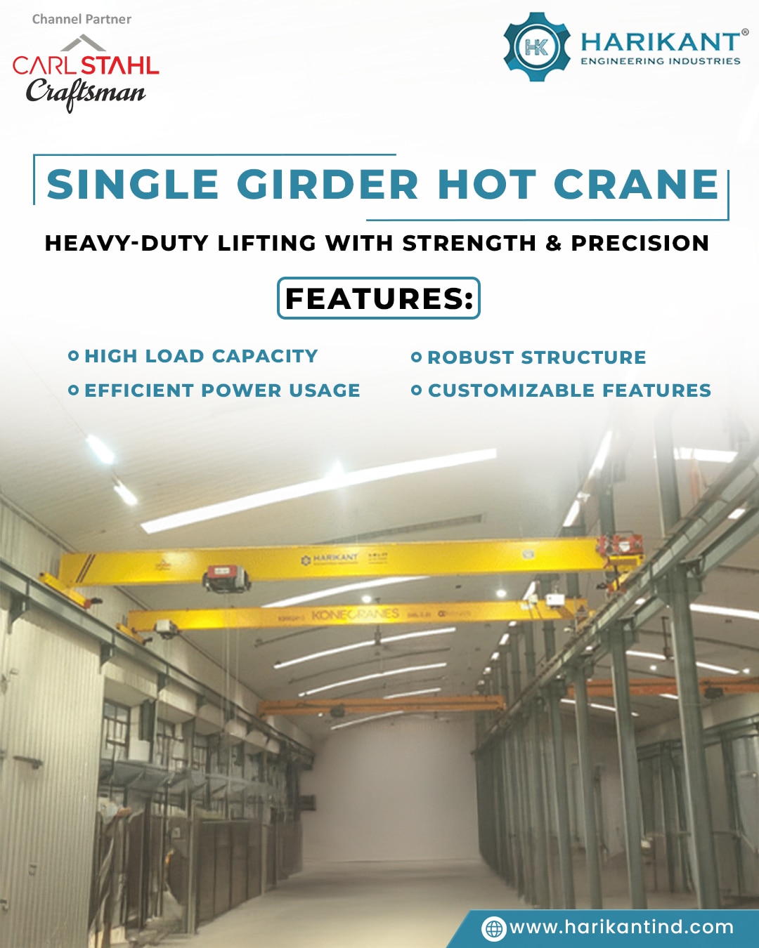 Top Double Girder Hot Crane Manufacturers in India. When it comes to handling heavy loads with precision, durability, and safety, Harikant Engineering Industries stands as a trusted name. The Double Girder Hot Crane is a flagship lifting solution designed to meet the demanding requirements of modern industries. Engineered with strict adherence to IS standards, it ensures unmatched performance, reliability, and longevity in every operation. The Double Girder Hot Crane from Harikant is more than just a lifting machine—it’s a performance-driven solution tailored for industrial excellence. Manufactured in accordance with IS-3177, IS-4137, and IS-807, this crane is built with a strong safety factor, making it a dependable choice for businesses that prioritize both productivity and workplace security. Its conventional as well as modular design gives industries the flexibility to choose configurations best suited for their operations. The use of plate box type girders, standard rolled steel, or compound beams ensures structural rigidity and 100% reliable weld joints. Harikant also integrates special crane duty motors (S4), squirrel cage & slip ring types to deliver smooth, efficient, and heavy-duty performance. Technical Specifications • Span Range: 5 mtrs. to 80 mtrs. • Safe Working Load (SWL): 500 kgs. to 1,50,000 kgs. • Design Standard: IS-3177, IS-4137, IS-807 • Girders: Plate box type / Rolled steel / Compound beams (IS: 2062-1992 material) • Motors: Crane duty (S4) squirrel cage & slip ring motors as per IS-325 • Brakes: Disc, shoe, thruster brakes; DC brakes available on request • Power System: Hoist and cross travel powered via trailing cables, drag chain, or DSL system • Safety Features: Limit switches for motion stoppers to prevent over-traveling Tested Performance Every Double Girder Hot Crane is tested under rigorous conditions to ensure superior reliability. Harikant Engineering incorporates disc and thruster braking systems, safety limit switches, and high-quality motors for precision control. The cranes are designed to withstand continuous heavy-duty cycles while maintaining efficiency and minimizing downtime. With stringent quality checks at every stage, clients can trust in consistent, long-term performance. Built for Industry Professionals Harikant understands the evolving demands of industries. That’s why the Double Girder Hot Crane is tailored for professionals who value efficiency, strength, and safety. With modular designs, high load capacities, and durable structural components, it supports seamless workflows even in the most challenging environments. Where to Use the Product The Double Girder Hot Crane finds its application in a wide spectrum of industries, including: • Steel plants and foundries for handling heavy castings and billets • Automobile manufacturing units for moving large machine components • Power plants for equipment installation and maintenance • Textile and paper industries for managing bulky rolls and machinery • Engineering workshops and warehouses for efficient material handling • Ports and shipyards for large-scale cargo and equipment movement The Double Girder Hot Crane by Harikant Engineering Industries is more than a piece of equipment—it’s a promise of performance, safety, and innovation. With its tested reliability, modular flexibility, and industry-ready features, it continues to empower businesses to lift smarter, safer, and stronger.